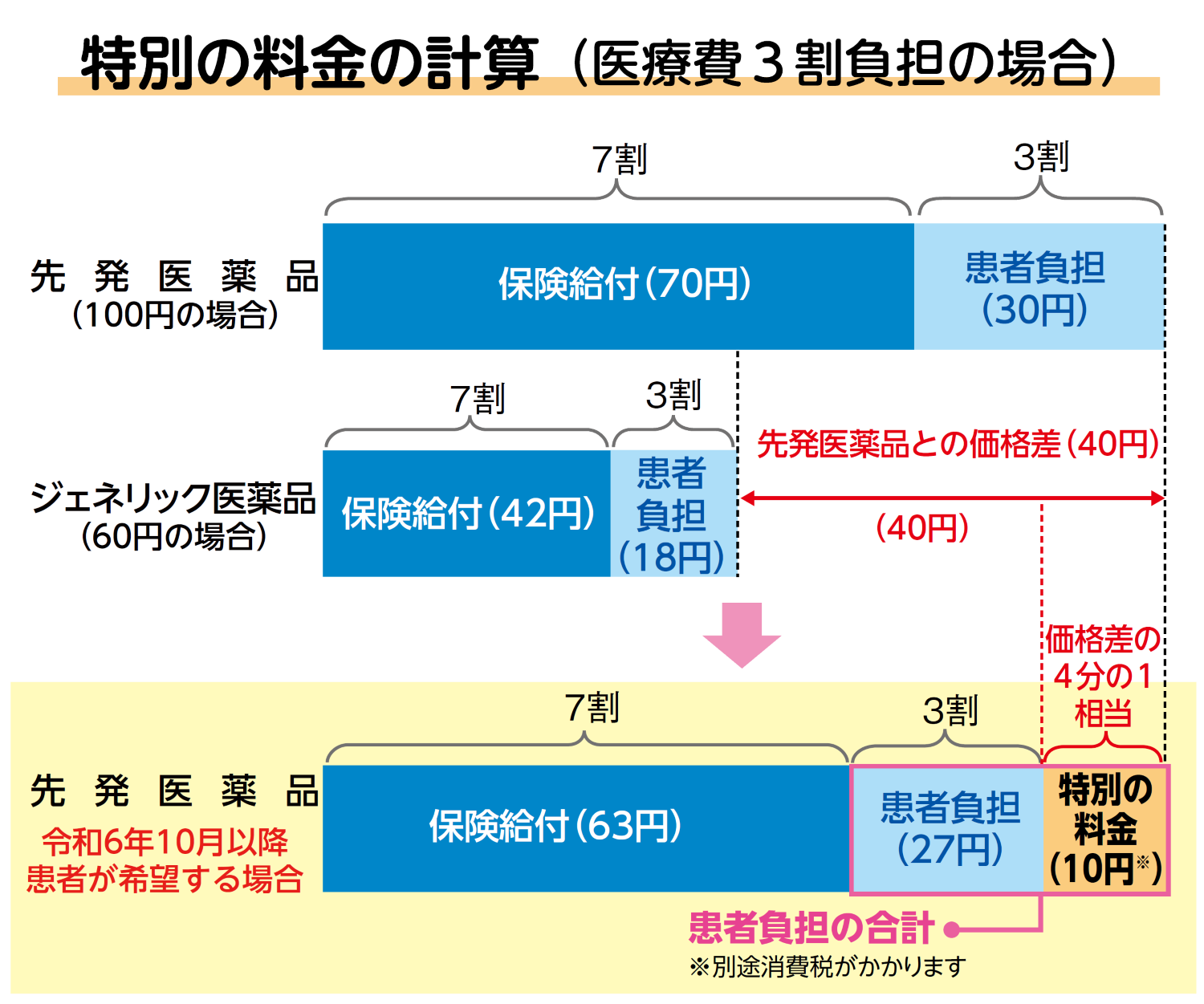 先発医薬品とジェネリック医薬品(最も高額のもの)の価格差の4分の1の額が医療費の自己負担とは別にかかります。特別料金は、調剤薬局で薬を受け取る際に医療費の自己負担と一緒に支払います。