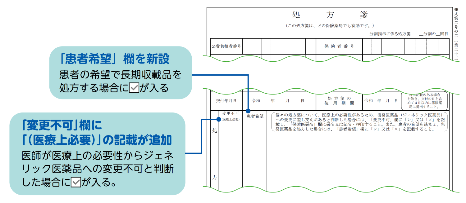 処方箋に「患者希望」欄があり、ジェネリック医薬品のある先発医薬品(長期収載品)の処方を希望した場合はチェックがあります。